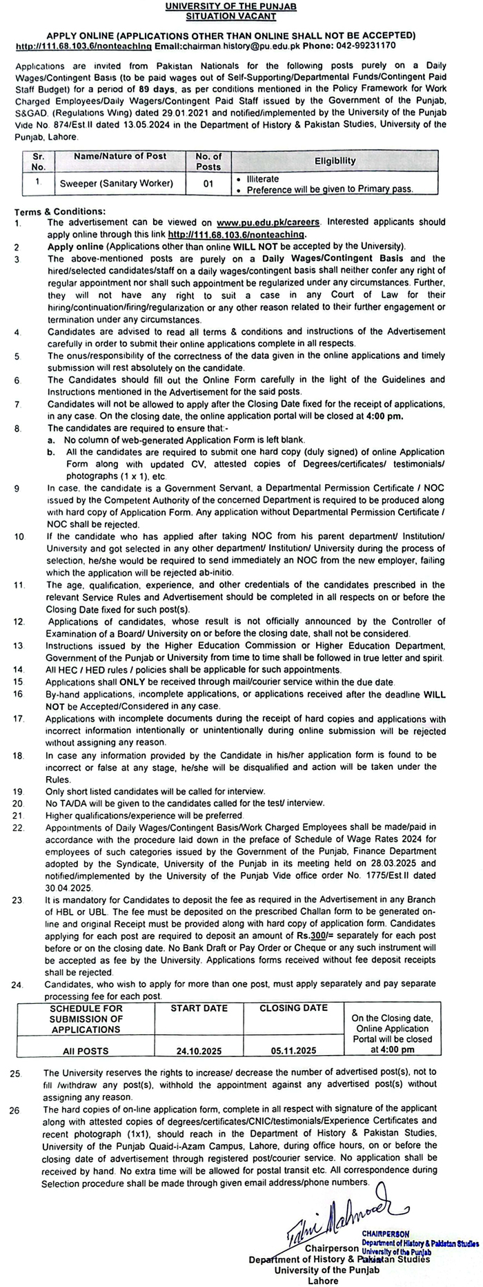 Job Type: SITUATION VACANT - Sweeper (Sanitary Worker) (posts purely on a Daily Wages / Contingent Basis) No. of Posts: Department: Department of History & Pakistan Studies