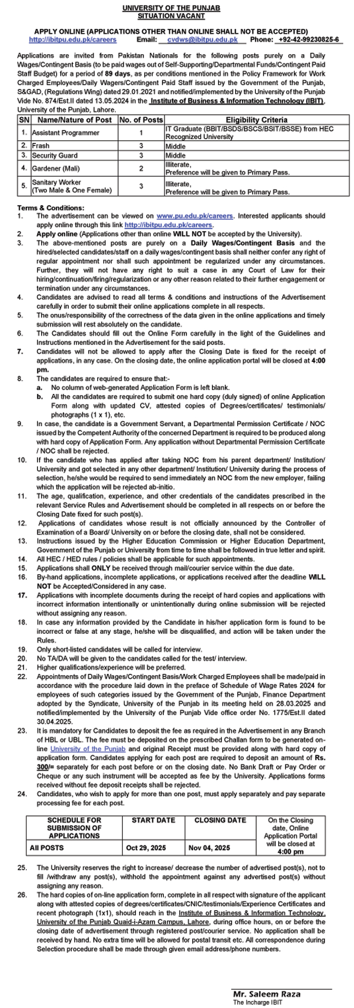 | Job Type: SITUATION VACANT - Assistant Programmer, Frash, Security Guard, Gardener (Mali) and Sanitary Worker (posts purely on a Daily Wages / Contingent Basis)