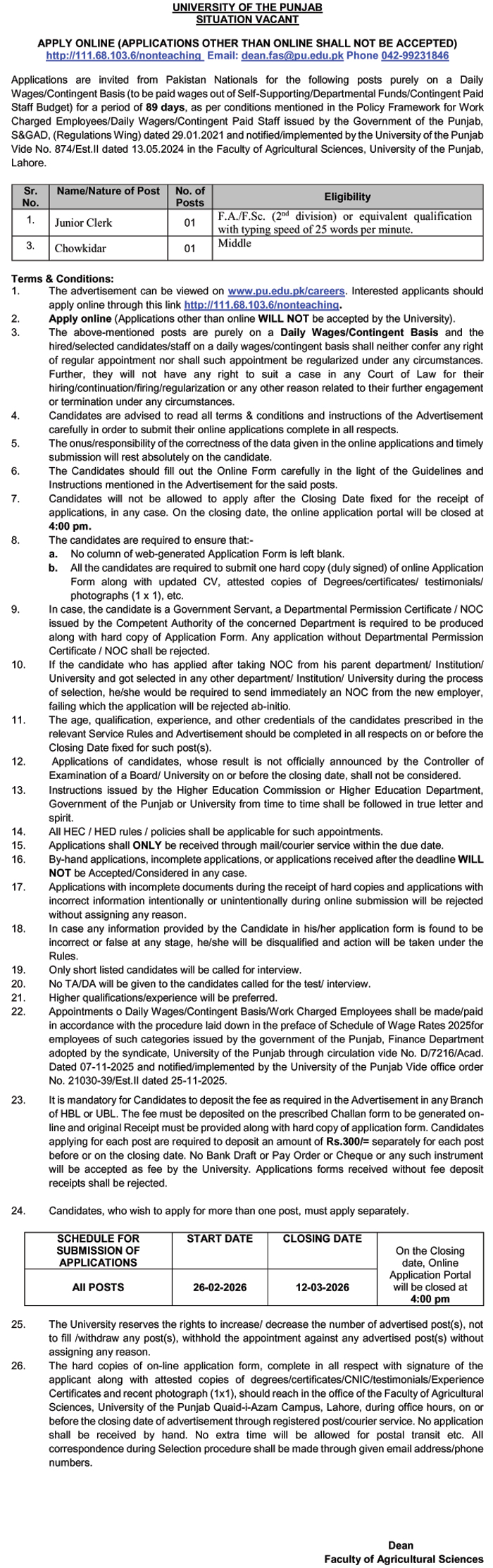 Careers SITUATION VACANT - Junior Clerk and Chowkidar (posts purely on a Daily Wages / Contingent Basis) Job Type: SITUATION VACANT - Junior Clerk and Chowkidar (posts purely on a Daily Wages / Contingent Basis)No. of Posts: Department: Faculty of Agricultural Sciences Requirement Apply online (applications other than online shall not be accepted) Click here to Apply Online http://111.68.103.6/nonteaching Email: dean.fas@pu.edu.pk Phone 042-99231846 Criteria Closing Date 12-03-2026 Contact Back to Careers