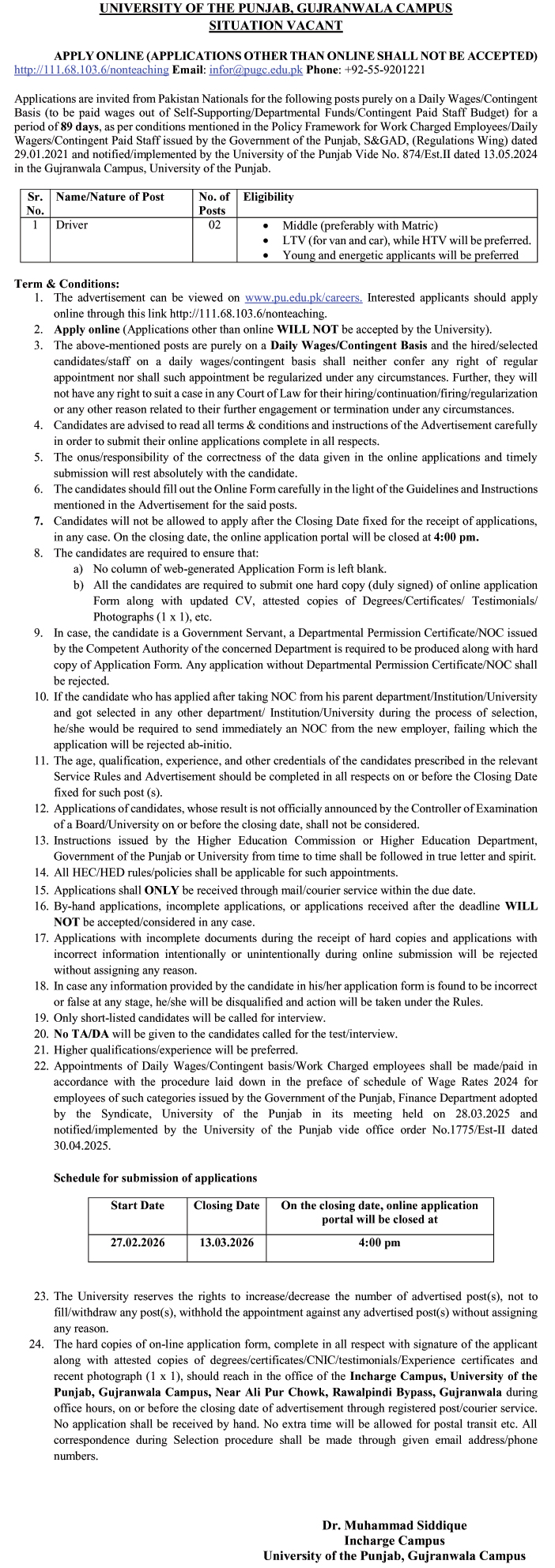 Careers SITUATION VACANT - Driver (Gujranwala Campus) (posts purely on a Daily Wages / Contingent Basis) Job Type: SITUATION VACANT - Driver (Gujranwala Campus) (posts purely on a Daily Wages / Contingent Basis)No. of Posts: Department: Gujranwala Campus Requirement Apply online (applications other than online shall not be accepted) Click here to Apply Online http://111.68.103.6/nonteaching Email: infor@pugc.edu.pk Phone: +92-55-9201221 Criteria Closing Date 13-03-2026 Contact Back to Careers