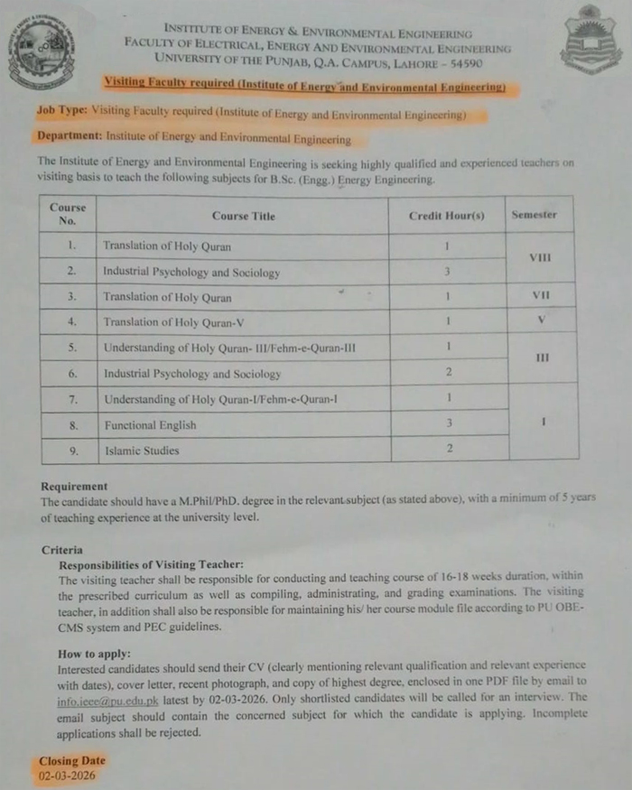 | Visiting Faculty Required (Institute of Energy & Environmental Engineering) |